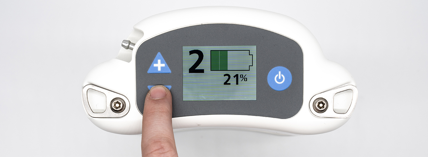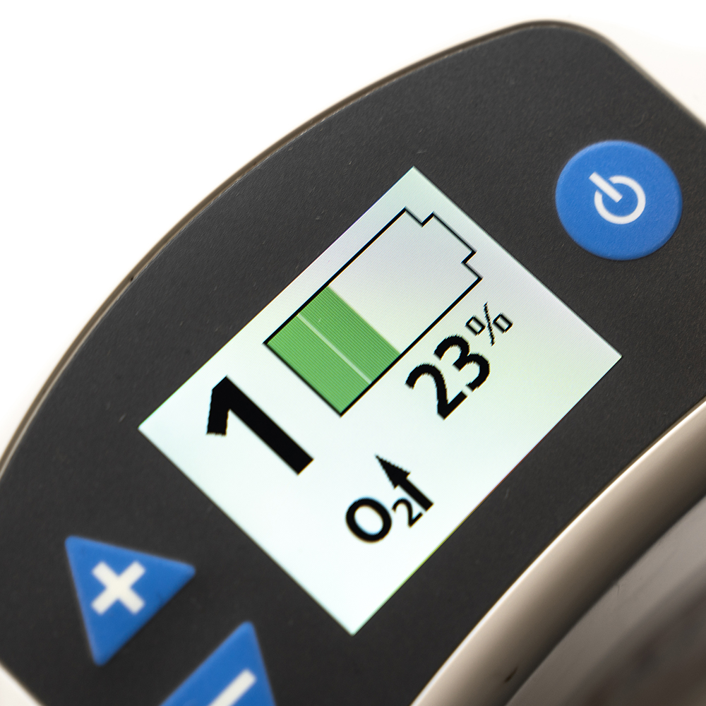 The large LCD screen shows current setting and remaining battery life in colour. Should the Comfort sound an alarm IE low battery or detached nasal cannula, the user will be prompted with an easy to understand graphic on the display to help troubleshoot the problem.