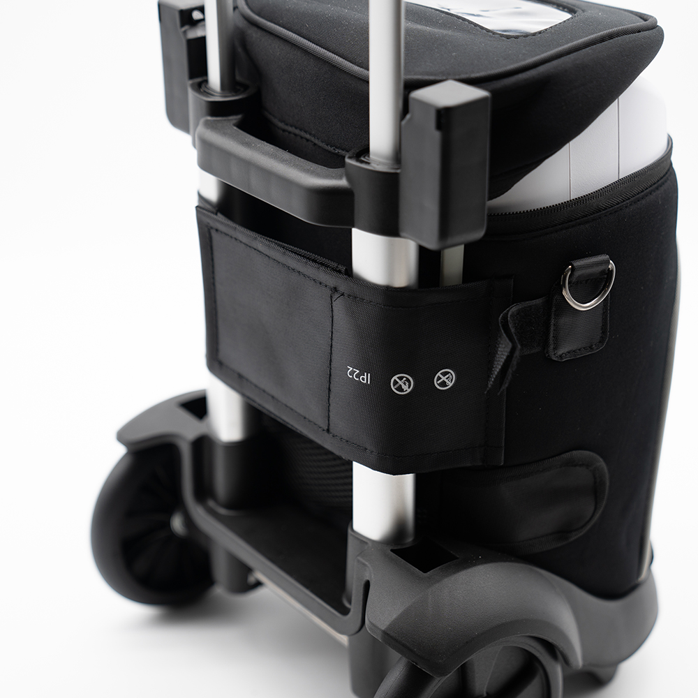 The Zen-O™ has two flow modes. Ideal for users that have a specific requirement for continuous flow oxygen and/or for use alongside a CPAP/ BiPAP machine. Although the Zen-O™ can be worn over the shoulder, it may prove physically challenging for some. Zen-O™ is provided with a large wheel pull cart where the machine can easily be mounted and secured with a velcro strap. The telescopic handle can be adjusted at a height to suit. The Zen-O™ is proudly made in Great Britain.
