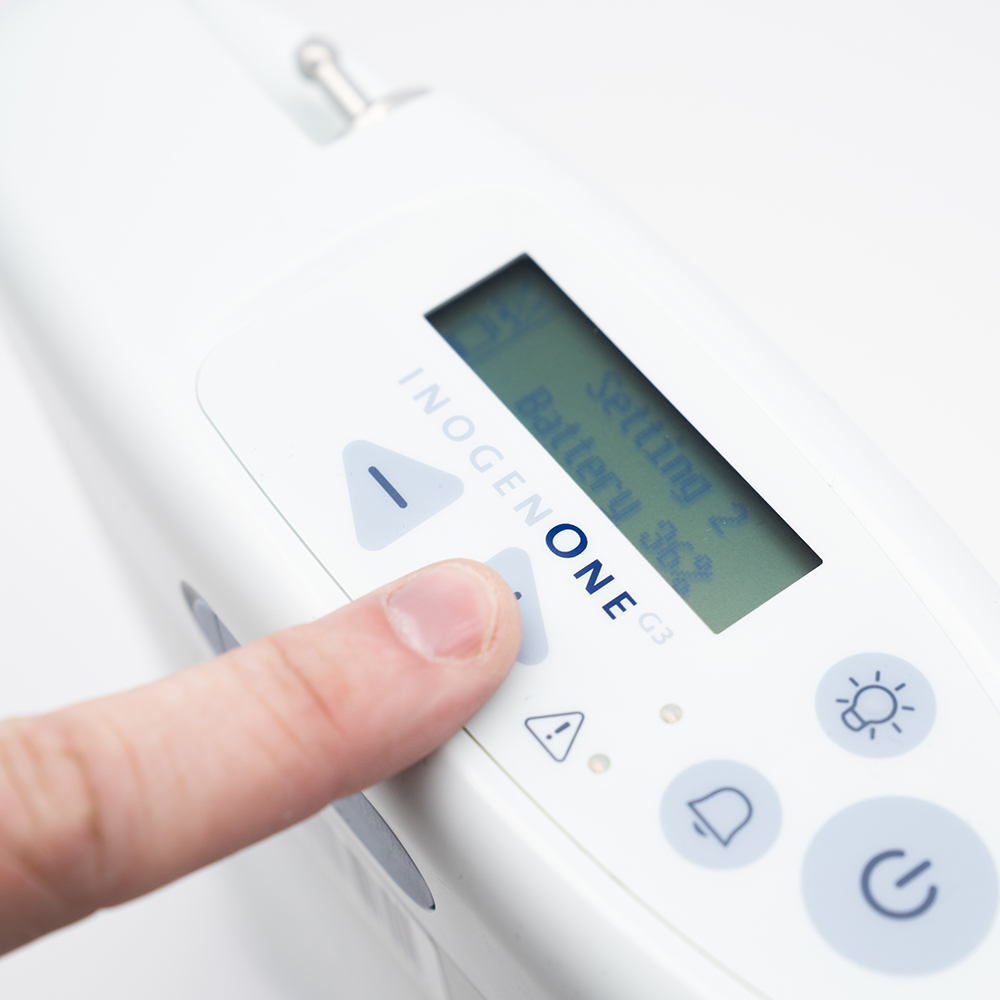 Users can opt to purchase the INOGENONE® G3 with either an 8 or 16 cell battery. The INOGENONE® G3 with a 16-cell battery installed offers the best battery life with up to 9 hours operation time (based on lowest setting). However, it does come with a small compromise adding a further ¾ lb to the overall carrying weight of the machine.