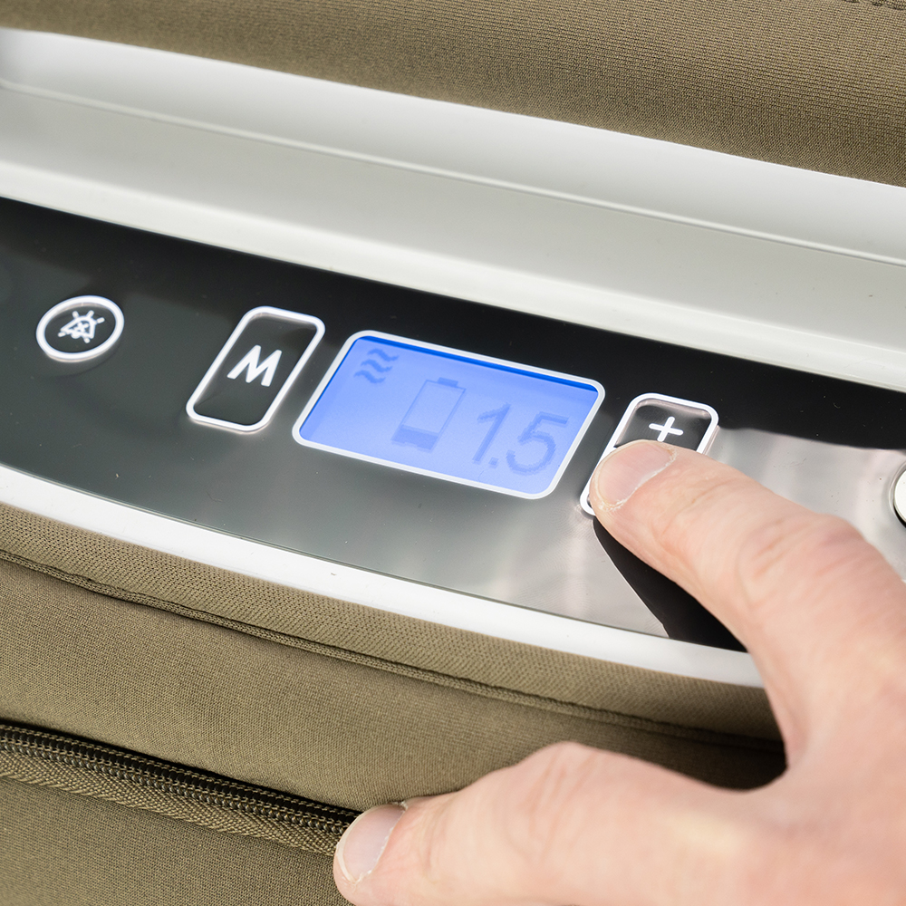 The backlit LCD display shows the current setting, mode and remaining battery life in hours and minutes. The mode and flow settings can easily be changed by pressing the plus and minus buttons
