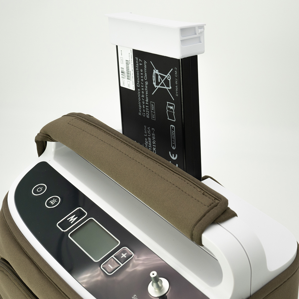 This highly compact concentrator has a pulse flow mode with up to 6 settings and a continuous flow mode that provides a maximum of 2 litres per minute. It also features a unique “sleep mode” function. When activated, pulse flow becomes more sensitive to breath intake and automatically reverts to continuous flow mode if no breath is detected.
